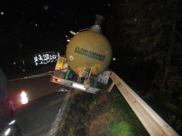 Am Montag, 12. Oktober 2015, fuhr gegen 20.30 Uhr ein landwirtschaftlicher Schlepper mit anhängendem gefülltem Güllefass die B421/Zeller Berg in Richtung Tellig. Kurz vor der Abzweigung zur Mülldeponie wurde das Gespann durch einen Sattelzug überholt. Bedingt durch Gegenverkehr zog der Sattelzug nach rechts. Um einen Zusammenstoß mit diesem zu vermeiden, wich der landwirtschaftliche Zug nach rechts aus und kam hierbei auf den unbefestigten Randstreifen. Aufgrund ihres Gewichtes blieben Schlepper und Anhänger stecken und drohten umzukippen. Der Fahrer des Sattelzuges setzte seine Fahrt fort, ohne sich um den entstandenen Schaden zu kümmern. Zwecks Sicherung und weiterer Maßnahmen wurde die Feuerwehr verständigt. Im Einsatz war anschließend ein Großaufgebot der Wehren aus Zell, Briedel und Blankerath. Die B421 musste hierzu für ca. 1,5 Stunden für den Verkehr komplett gesperrt werden. Von dem Sattelzug ist nur bekannt, dass der Auflieger vermutlich eine dunkle Plane hatte. Angaben zu dem entgegenkommendem Fahrzeug konnten ebenfalls nicht erlangt werden. Hinweise bzgl. der beiden Fahrzeuge bitte an die Polizei Zell, Tel. 06542/98670, oder pizell@polizei.rlp.de