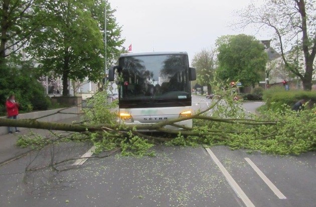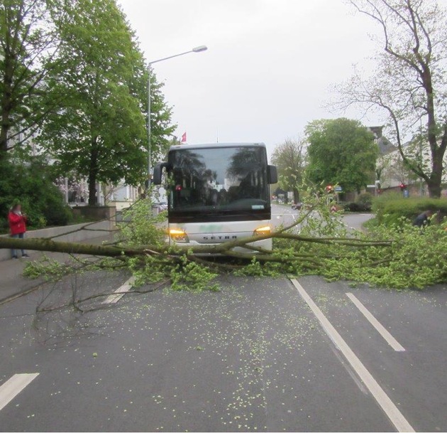 In der Trierer Nordalle stürzte am Montagmorgen, 25. April, ein Baum auf die Fahrbahn. Verletzt wurde niemand. Die Insassen eines Linienbusses kamen mit dem Schrecken davon. Der Linienbus wurde leicht beschädigt.