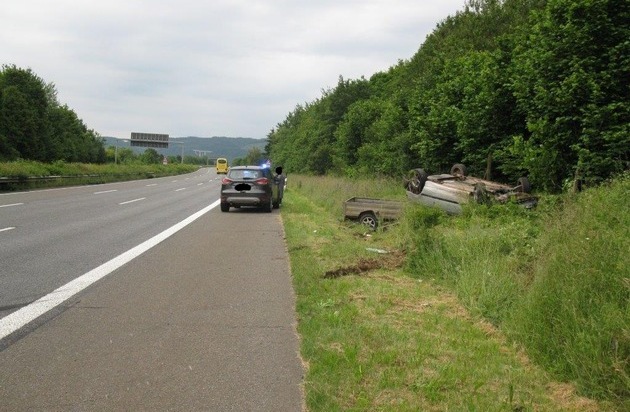Am Samstag, 11.06.2016, wurde eine Zivilstreife der Polizeiinspektion Wittlich gegen 06.25 Uhr im Rahmen einer Verkehrskontrolle in Binsfeld auf einen Golf 3 mit WND-Kennzeichen samt Anhänger aufmerksam. Beim Versuch das Fahrzeug anzuhalten, flüchtete der Fahrer in Richtung Niederkail und Arenrath. Hierbei benutzte er auch Feld- und Waldwege. Von Arenrath aus ging die Flucht weiter über die L 50 durch die Ortslage Dreis. Dort rammte der Flüchtige einen Funkstreifenwagen und das Zivilfahrzeug, weiterhin wurde eine Hauswand leicht beschädigt. Weiter ging die Verfolgungsfahrt über die L 141 und die L 47 in Fahrtrichtung Autobahn A 1, auf die der Flüchtige in Fahrtrichtung Saarbrücken einfuhr. Alle weiteren Anhalteversuche auf der Autobahn verliefen ebenfalls erfolglos. Hierbei beschädigte der flüchtende Autofahrer zwei weitere Funkstreifenwagen. Kurz hinter dem Autobahndreieck Moseltal rammte der Fahrer des VW Golf einen weiteren Zivilwagen der Polizei. Dabei verlor er die Kontrolle über sein Fahrzeug und überschlug sich in der angrenzenden Böschung. Der unfallflüchtige Fahrer, ein 28-jähriger Mann aus dem Kreis St. Wendel, wurde leicht verletzt. Der Führerschein des Flüchtigen wurde beschlagnahmt, ihm wurde eine Blutprobe entnommen.