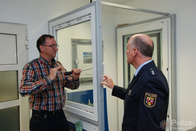 Einmal bei der Polizei einbrechen dürfen: Das beigefügte Foto zeigt einen Besucher, der im Beisein von Polizeihauptkommissar Michael Lui, das Fenster am "Prüfstand" aufhebeln durfte.