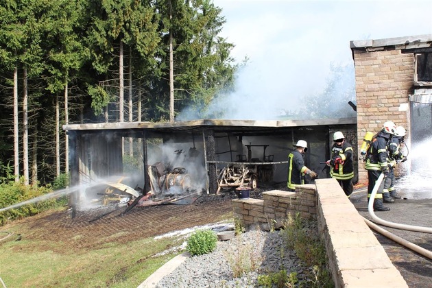 Zum Brand einer Doppelgarage mit angebautem Schuppen kam es am Dienstag, 11. Juli 2017 in Kleinlangenfeld, Eifelkreis Bitburg-Prüm. Gegen 08.45 Uhr hatte eine Anwohnerin bemerkt, dass es in der Garage, bzw. dem daran angebauten Schuppen brannte und sofort die Rettungsleitstelle verständigt. Von dort aus wurden Feuerwehr und Polizei alarmiert. Trotz intensiver Bemühungen konnte nicht verhindert werden, dass erheblicher Sachschaden entstand. Ein in der Garage abgestellter Pkw brannte vollkommen aus. Gleiches gilt für einen im Schuppen abgestellten Traktor. Beschädigt wurden zudem einige ebenfalls dort befindliche Baumaschinen. Zudem kam es infolge der Hitzeentwicklung zur Explosion einer Gasflasche. Der Schaden dürfte nach ersten Schätzungen mehr als 100000 Euro betragen. Zur Ermittlung der Brandursache wurde ein Sachverständiger eingeschaltet. Zur Brandbekämpfung waren eingesetzt die Feuerwehren aus Kleinlangenfeld, Olzheim und Prüm.