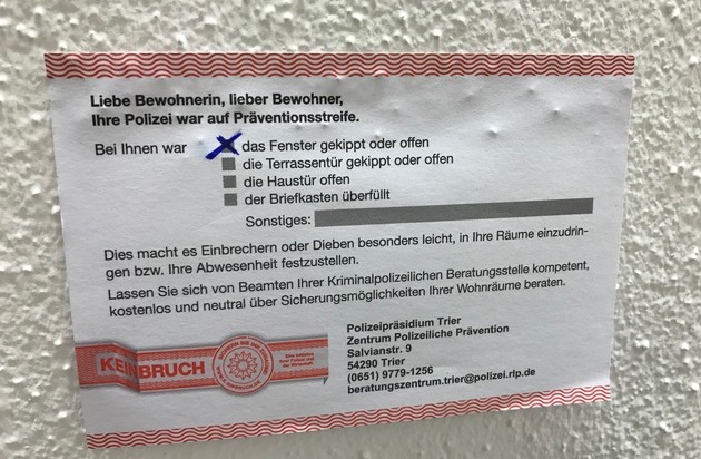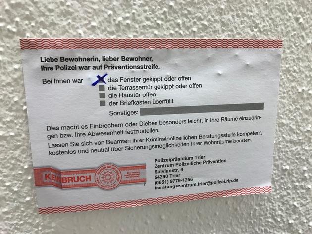 Donnerstagmorgen, 10 Uhr, in Birkenfeld: Einsatzkräfte der Bereitschaftspolizei und Präventionsbeamte des Zentrums Polizeiliche Prävention des Polizeipräsidiums Trier machen sich auf den Weg durch den Landkreis Birkenfeld. Ihr Auftrag: Präventionsstreifen zum Thema "Einbruchschutz". Sie klingeln zum Beispiel in Idar-Oberstein, Birkenfeld, Niederbrombach und Baumholder an den Haustüren der Einwohner und informieren sie über die Möglichkeiten, ihr Hab und Gut vor Einbrechern und Dieben zu schützen. Etwa an 200 Haushalte verteilen die Beamten die Broschüre "Ungebetene Gäste", der Polizeilichen Kriminalprävention, in der über verhaltensbezogene und sicherungstechnische Möglichkeiten des Einbruchschutzes informiert wird. Wie man sich nicht richtig verhält, erleben die Beamten an diesem Tag auch. Bei 34 Wohnobjekten, deren Bewohner nicht zu Hause waren, stellten sie gekippte Fenster im Erdgeschoss, offene Garagentore und unverschlossene Fahrräder oder andere Gerätschaften fest. "Hier hätten sich Einbrecher oder Diebe ohne großen Aufwand bedienen können," sagt Marc Powierski vom Zentrum Polizeiliche Prävention des Polizeipräsidiums Trier, der den Präventionseinsatz leitet. Damit diese Bewohner künftig besser aufpassen, kleben Powierski und seine Kollegen Hinweiszettel an die Häuser. "Bei Ihnen war das Fenster gekippt" ist darauf zu lesen, verbunden mit dem Angebot einer Beratung über Sicherungsmöglichkeiten durch die Experten der Polizei. Speziell ausgebildete Einbruchschutzberater informieren kostenlos und produktneutral über Sicherungsmöglichkeiten und geben Verhaltenstipps. Beratungstermine können beim Polizeipräsidium Trier telefonisch oder per Postkarte angefordert werden. Weitere Infos zum Thema gibt es unter http://s.rlp.de/TE0