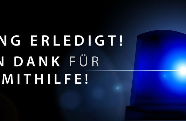 Nachdem eine Bekannte die 35-Jährige am 22. November als vermisst gemeldet hatte, suchte die Polizei nach der Frau. Nach ersten Ermittlungen konnte ein Unglücksfall nicht ausgeschlossen werden. Dank einiger Zeugenhinweise aufgrund der Öffentlichkeitsfahndung haben Polizeibeamte die Frau nun aufgefunden. Sie ist wohlauf. Glücklicherweise hat sich der Verdacht auf einen Unglücksfall nicht bestätigt. Die Polizei bedankt sich bei allen Zeugen für die Hinweise.