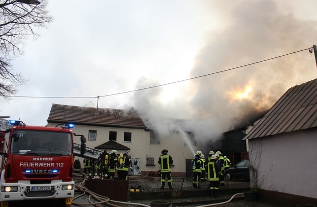 Am Donnerstag, 11. Januar 2018, kam es im Oberpierscheider Ortsteil Philippsweiler zum Brand eines Einfamilienhauses. Aus bislang noch unklarer Ursache brach im ehemals landwirtschaftlich genutzten Nebengebäude ein Brand aus. Die Flammen griffen in der Folge auch auf das Dachgestühl des Haupthauses über. Eine zum Zeitpunkt des Brandausbruchs im Haus weilende Bewohnerin konnte das Haus selbständig und unverletzt verlassen. Durch das schnelle Eingreifen der Feuerwehren aus Oberpierscheid, Neuerburg, Waxweiler, Lünebach, Krautscheid, Arzfeld und Plütscheid, welche mit rund 50 Mann und mehreren Fahrzeugen vor Ort waren, konnte ein Vollbrand des Einfamilienhauses abgewendet und der Schaden begrenzt werden. Die Höhe des Sachschadens ist noch unklar. Der Kriminaldienst der Polizeiinspektion Prüm hat die Ermittlungen zur Brandursache aufgenommen.