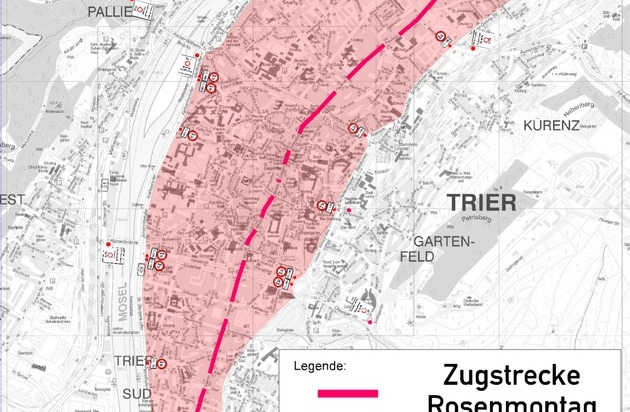 Gleiches gilt für die Zugstrecke des Trierer Karnevalsumzugs am Rosenmontag. Auch hier hat die Stadtverwaltung ein zeitlich und örtlich begrenztes Verbot für bestimmte schwere Fahrzeuge entlang der Zugstrecke erlassen (siehe Anlage).