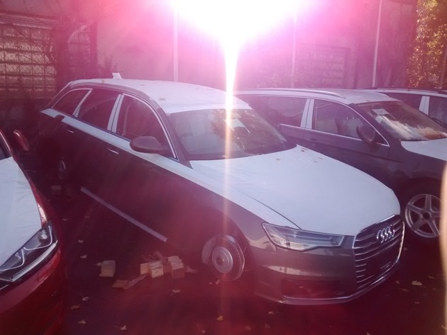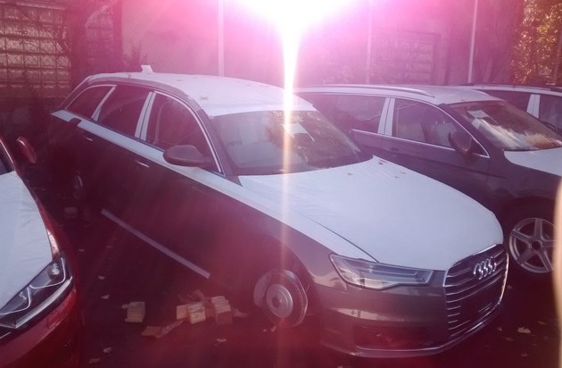 Bislang unbekannte Täter machten sich am vergangenen Wochenende an einem Audi A6 zu schaffen. Der Neuwagen war auf dem Freigelände eines Autohauses in der Mainzer Straße abgestellt und zur Auslieferung an einen Kunden bestimmt. Die Täter bockten den Wagen auf, demontierten die vier Alukompletträder und stellten das Fahrzeug dann teils auf den Bremsscheiben, teils auf Holzklötzen ab. Bei der Tatausführung beschädigten sie zudem einen neben dem Audi geparkten VW Passat, an dem sie den Spiegel abbrachen und den Kotflügel eindrückten. Die Reifen und Felgen hatten einen Wert 4000,- Euro. Der entstandene Sachschaden an beiden Fahrzeuge dürfte sich auf mehrere tausend Euro summieren. Hinweise nimmt die Polizei Worms unter der Rufnummer 06241-8520 entgegen.