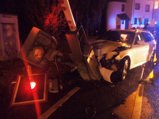 Gegen 20:00 Uhr befuhr am Samstag, 22.10.2016, ein 39jähriger Pkw-Fahrer die Alzeyer Straße (B271) in Flörsheim-Dalsheim aus Richtung Oberflörsheim kommend in Richtung Monsheim. In der Linkskurve am dortigen Bahnübergang kam der Pkw auf regennasser Fahrbahn nach rechts ab und kollidierte mit der Schrankenanlage. Unfallursache dürfte überhöhte Geschwindigkeit sowie die erhebliche Alkoholisierung des Fahrers gewesen sein. Dem Fahrer wurde eine Blutprobe entnommen, sein Führerschein wurde sichergestellt. An Pkw und Schrankenanlage entstand Totalschaden in Höhe von ca. 30.000,- Euro.