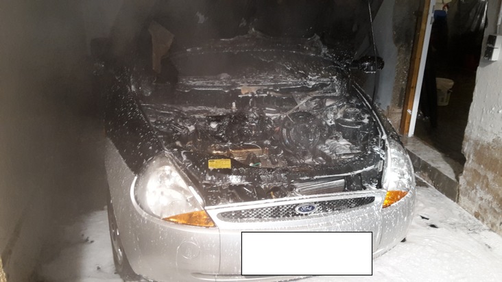 In der Silvesternacht gerät gegen 01:45 Uhr ein Ford Ka, der in einer offenen Garage geparkt ist, in der Talstraße in Worms in Brand. Der Motorraum des Pkw brannte aus, jedoch konnte durch die Feuerwehr Worms weiterer Schaden verhindert werden. Die Brandursache steht bislang nicht fest. Brandausbruch durch Feuerwerkskörper scheint unwahrscheinlich, kann jedoch nicht gänzlich ausgeschlossen werden. Die Schadenshöhe beträgt ca. 3000,- Euro.