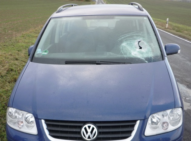 Ein 83-jähriger Hillesheimer befuhr mit seinem VW Touran am Montagnachmittag gegen 14.30 Uhr die Landesstraße 425 zwischen Hillesheim und Dittelsheim-Heßloch, als ihm in der Frettenheimer Gemarkung ein dicker Stein gegen die Frontscheibe knallte, der die Größe einer Zuckerrübe hatte. Der Stein durchschlug die Windschutzscheibe und beschädigte auch das Interieur des Wagens. Der Fahrzeugführer duckte sich reaktionsschnell und wurde dadurch nicht verletzt. Sein Wagen geriet jedoch auf den unbefestigten Seitenstreifen, wo Reifen samt Felgen auch noch beschädigt wurden. Woher der große Stein (Bruchstein) kam, ist bisher noch nicht bekannt. Er könnte von einem Abriss stammen oder ähnlichem. Da er nicht verschmutzt oder bemoost war, kommt ein Ackerstein nicht in Frage. Ein LKW mit Schutt oder dergleichen scheint wahrscheinlicher. Die Polizei sucht nun Zeugen. Hat jemand den Unfallhergang gesehen, kann jemand Hinweise zu dem Geschehnis geben, dann Polizei Alzey - 06731-9110.