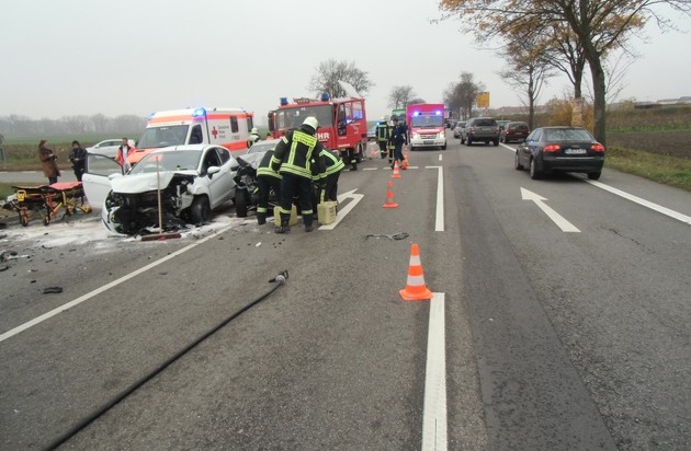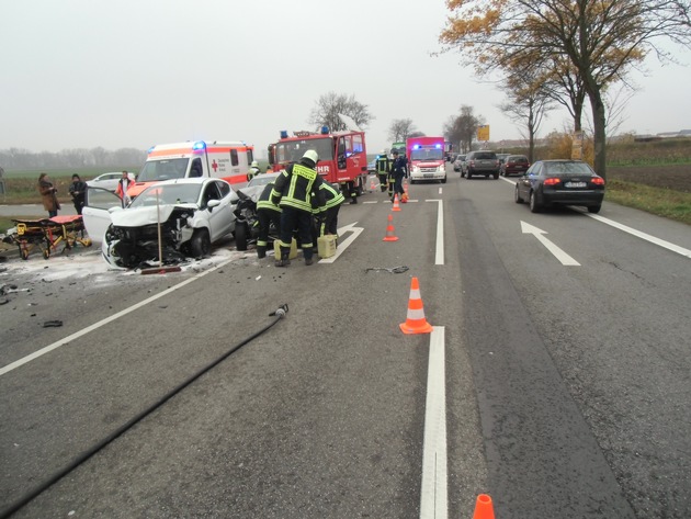 Die 20-jährige PKW-Führerin befährt am Freitag, den 17.11.2017, gegen 13:30 Uhr die B9 aus Richtung Mainz kommend in Richtung Worms und will an der Einmündung zur L437 nach links in Richtung Gimbsheim abbiegen. Beim Abbiegevorgang übersieht die Frau aus Hamm den entgegenkommenden bevorrechtigten PKW, der durch einen 21 Jahre alten Mann aus Worms geführt wird. Im Einmündungsbereich kommt es zum Frontalzusammenstoß der beiden PKW. An beiden Fahrzeugen entsteht Sachschaden in Höhe von geschätzten 20.000 EUR, beide PKW sind nicht mehr fahrbereit und müssen im Verlauf durch Abschleppdienste geborgen werden. Beide Fahrzeugführer werden nach bisherigem Kenntnisstand bei dem Verkehrsunfall verletzt (Bauchtrauma, Schürfwunden) und werden nach medizinischer Erstversorgung vor Ort durch einen Notarzt zur weiteren Abklärung des Gesundheitszustandes in umliegende Krankenhäuser eingeliefert. Die Unfallstelle auf der B9 wird im Zeitraum der Verkehrsunfallaufnahme zwischen 13:45 und 15:00 Uhr in Fahrtrichtung Mainz gesperrt.