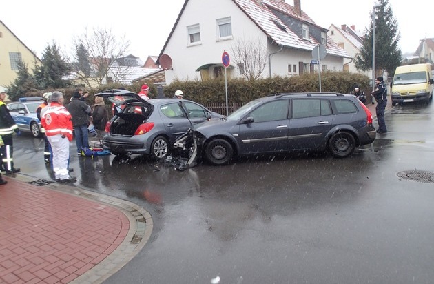 Am 17.02.2018 gegen 11:37 Uhr missachtete eine 78 jährige Pkw-Führerin die Vorfahrt in der Neustraße/Friedenstraße in Eisenberg und kollidierte mit einem 54 jährigen Autofahrer. Dieser und die Beifahrerin des verursachenden Fahrzeuges wurden leicht verletzt.