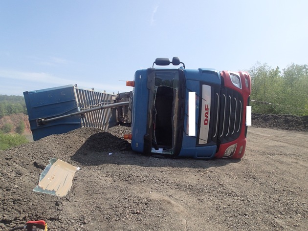 In einem Steinbruch in der Nähe von Kirchheimbolanden kam es am 18.05.2018 gegen 14:27 Uhr zu einem Betriebsunfall mit einem LKW. Der 54 jährige Fahrer war gerade dabei seinen Kipper zu entladen, als der LKW auf dem weichen, abschüssigen Untergrund aus dem Gleichgewicht geriet und nach rechts umkippte. Der Fahrer wurde glücklicherweise nur leicht verletzt, musste jedoch von der Feuerwehr aus seinem Führerhaus befreit werden.