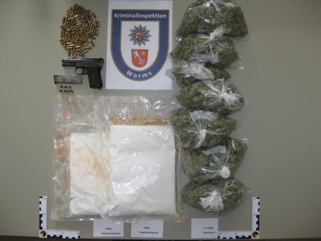 Aus diesem Grund wurden am 23.05.2018 in Worms, Mannheim und Bürstadt mehrere Wohnungen, Geschäftsräume und Gartengrundstücke durchsucht und insgesamt 6 Personen vorläufig festgenommen. Gegen einen 26-jährigen und einen 36-jährigen Wormser und einen 33-jährigen Mannheimer wurden Haftbefehle erlassen. Insgesamt konnten bei den Durchsuchungsaktionen, bei denen Spezialeinheiten aus ganz Rheinland-Pfalz beteiligt waren, eine Pistole mit Munition, zwei Kilogramm Amfetamin sowie ein Kilogramm Marihuana aufgefunden und sichergestellt werden. Weiterhin wurden zwei hochwertige Fahrzeuge im Wert von ca. 100.000 Euro sichergestellt .