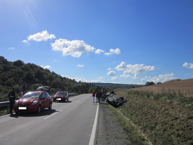 Am 28.09.2015 kam es um 11:40 Uhr auf der Landesstraße 233 zwischen Steinhardt und Bad Sobernheim zu einem Verkehrsunfall. Die Fahrerin eines Pkw geriet in einer langgezogenen Linkskurve auf die Gegenfahrbahn. Beim Gegenlenken geriet sie ins Schleudern und kam von der Fahrbahn ab. Der Pkw überschlug sich und kam auf dem Dach liegend im Straßengraben zum Stillstand. Die 27-jährige Pkw-Fahrerin und ihre 23-jährige Beifahrerin wurden durch den Überschlag lediglich leicht verletzt. Ein einjähriger Junge, welcher auf dem Rücksitz angegurtet war, blieb unverletzt. Der total beschädigte Pkw musste geborgen werden.