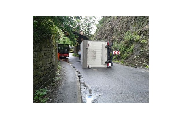 Ein Linienbus der ORN befuhr die Landstraße 214 in Fahrtrichtung Ortskern Stromberg. Bei einem Wendevorgang wurde die Ölwanne des Buses beschädigt, sodass das austretende Öl die Fahrbahn verschmutzte. Aufgrund dessen kam es zu Verkehrsbehinderungen, sodass mehrere Pkw an der Örtlichkeit anhalten mussten. Ein 33-jähriger Lkw-Fahrer, der die Landstraße 214 ebenfalls in Richtung Ortskern befuhr, bemerkte zwar die stehenden Pkw, konnte aufgrund des Öls sein Fahrzeug aber nicht mehr rechtzeitig abbremsen. Er versuchte den Lkw rechts neben der Fahrbahn in die Böschung zu lenken. Hierbei kippte der Lkw langsam um und blieb auf der Fahrbahn liegen. Der 33-jährige Fahrer wurde leicht verletzt. Zu einem Kontakt mit einem weiteren Fahrzeug kam es nicht. Seit 11:00 Uhr war die Fahrbahn Landstraße 214 Simmerner Straße komplett gesperrt. Die Aufräumarbeiten dauerten noch mehrere Stunden an. Eine Spezialfirma wurde zum Reinigen der Straße hinzugezogen.