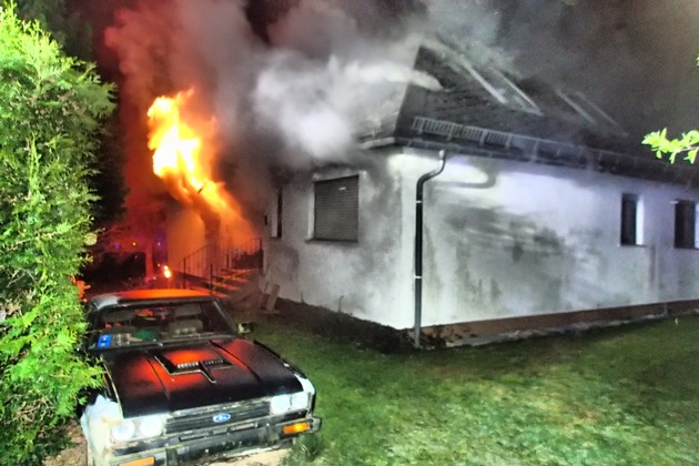 Am 07.04.2017 geriet ein Wohnhaus am Sportplatz in Brand. Ein Bewohner des Hauses entdeckte den Brand um 03:45 Uhr. Daraufhin konnten alle drei anwesenden Bewohner das Haus unverletzt verlassen und die Rettungskräfte alarmieren. Es waren nahezu 100 Feuerwehrkräfte aus verschiedenen Gemeinden im Einsatz, die den Brand, welcher zwischenzeitlich auf das gesamte Gebäude übergegriffen hatte, bekämpften. Nachdem das völlig zerstörte Wohnhaus gelöscht war, mussten noch einige Nachbrände im Dachstahl bekämpft werden. Zur Zeit wird der Brandort von der Kriminalpolizei untersucht. Zur Brandursache können nach dem aktuellen Ermittlungsstand noch keine Angaben gemacht werden.