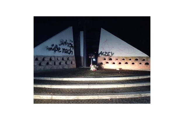 Im Laufe des Sonntag, 14.05.2017, wurden am Mahnmal erneut Sachbeschädigungen durch Farbschmierereien festgestellt. Unbekannte Täter haben Wände des Mahnmals und das dort aufgestellte Kreuz mit Schriftzügen und Farbe besprüht.