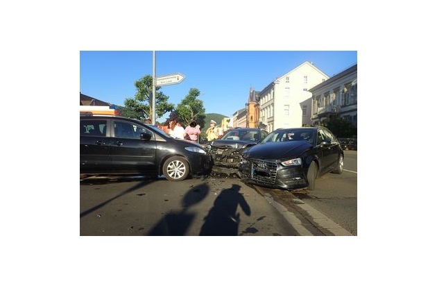 Am 19.06.2017 kam es um 07:00 Uhr in der Bahnhofstraße zum Frontalzusammenstoß dreier Pkw. Der Fahrer eines Audi A3 wollte von der Binger Landstraße nach links auf den Parkplatz vor dem Polizeigebäude fahren. Hierbei übersah er einen entgegenkommenden Hyundai und stieß mit diesem frontal zusammen. Durch den starken Aufprall wurden die beiden Fahrzeuge auf den Mazda einer Frau geschleudert, welche vom Bahnhofparkplatz nach links auf die Bahnhofstraße auffahren wollte. Der Fahrer des Audi und der Fahrer des Hyundai wurden durch den Zusammenstoß leicht verletzt. Sie mussten im Krankenhaus behandelt werden. Die Bahnhofstraße war während der Bergungsmaßnahmen für 90 Minuten halbseitig gesperrt. Es kam zu keinerlei Verkehrsstörungen.