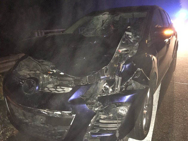 Die Polizei Kirn erhielt am 17.10.2017 um 04.13 Uhr mehrere Notrufe über eine Kuh-Herde, welche sich auf der Bundesstraße 41 im Bereich der Abfahrt Bad Sobernheim-Steinhardt befände. Ein Pkw soll bereits mit einem Tier zusammengestoßen sein. Zu diesem Zeitpunkt lag die Sichtweite wegen Bodennebels unter 50 Metern. Der 46-jährige Fahrer eines Mazda CX 7 war in Richtung Kirn unterwegs, als er im dichten Nebel eine Kuh aus der Herde erfasste. Hierbei wurde sein Pkw total zerstört. Der Fahrer hingegen blieb unverletzt. Die verletzte Kuh musste noch an der Unfallstelle tierärztlich versorgt werden. Die Unfallstelle wurde von mehreren Streifenwagen mit Unterstützung der Feuerwehr und der Straßenmeisterei abgesichert, so dass es zu keinen weiteren Unfällen kam. Da sich die entlaufenen Tiere auf oder neben der Fahrbahn befanden, musste die Bundesstraße 41 für 2,5 Stunden voll gesperrt werden. Letztlich konnten die übrigen Tiere unbeschadet eingefangen werden. Der verantwortliche Tierhalter bezifferte die Herde auf 16 Tiere. Die Polizei prüft nun, ob die Voraussetzungen zur Einleitung eines Ermittlungsverfahrens wegen gefährlichen Eingriffs in den Straßenverkehr gegen den Tierhalter vorliegen.