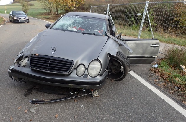 Am 26.10.2017 fuhr der Fahrer eines Mercedes CLK um 15.00 Uhr auf der Kreisstraße 61 von Boos in Richtung Staudernheim. In einer Rechtskurve verlor der Fahrer vermutlich aufgrund überhöhter Geschwindigkeit die Kontrolle über sein Fahrzeug, geriet ins Schleudern und kam von der Fahrbahn ab. Der Mercedes prallte gegen einen Hang und wurde zurück auf die Fahrbahn geschleudert. Dort blieb das Fahrzeug auf dem linken Fahrstreifen total beschädigt liegen. Alle Frontairbags hatten ausgelöst. Der 24-jährige Fahrer erlitt mehrere Schnittverletzungen und musste von einem Rettungswagen in ein Krankenhaus nach Bad Kreuznach verbracht werden. Der total beschädigte Mercedes musste geborgen werden.