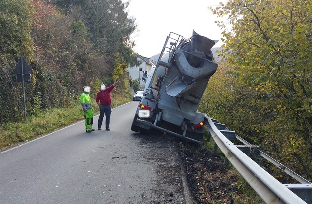 Am 06.11.2017 fuhr ein Betonmischer um 12.45 Uhr auf der Landesstraße 235 von Duchroth in Richtung Odernheim. Kurz vor der Ortseinfahrt Odernheim kam der Fahrer mit seinem Lkw nach rechts von der Straße ab und geriet auf die unbefestigte Bankette. Der vollbeladene Betonmischer blieb an der Leitplanke stecken und drohte in den Hang abzustürzen. Er musste mit einem Kran gesichert und anschließend wieder aufgerichtet werden. Die Bergungsarbeiten dauerten bis 17.00 an. Die Schäden an dem Betonmischer waren relativ gering. Zu Verkehrsbehinderungen kam es nicht.