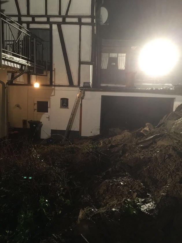 Aufgrund der erheblichen Niederschlagsmengen lösten sich hinter einem Anwesen "Auf der Schadenbach " in Manubach Erdmassen im Hang. Ein folgender Erdrutsch verschüttete einen auf dem Grundstück befindlichen privaten Tank mit Flüssiggas. Nach ersten Feststelllungen kam es zu keinem Gasaustritt, allerdings konnte eine Beschädigung des Tanks nicht ausgeschlossen werden. Eine Firma wurde mit dem Abpumpen des Flüssiggases beauftragt. Zur Räumung des Gerölls wurde eine Firma beauftragt, die mit Tieflader und Bagger anrückte. Aufgrund der Gefahrenlage war eine Evakuierung der Anwohner im Gefahrenbereich erforderlich. Gegen 03.30 Uhr konnten die Einsatzmaßnahmen beendet werden.