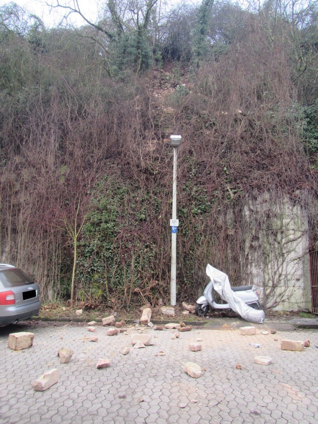Am 27.01.2018, gegen 10:00 Uhr, meldete ein aufmerksamer Bürger, dass am Ende der Klappergasse, kurz vor dem Eingang zum Panoramaweg, mehrere Steine vom Hang herunter gerollt wären. Die Stelle befinde sich auf Höhe der Hausnummer 21.