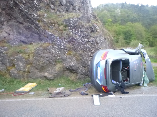 Am 21.04.2018, erging um 20.18 Uhr über die Integrierte Rettungsleitstelle Bad Kreuznach die Meldung über einen schweren Verkehrsunfall mit im Fahrzeug eingeklemmten Personen auf der B41 Höhe "Bärenbacher Brücke". Vor Ort konnte folgender Unfallhergang festgestellt werden: Der 25- jährige alleinbeteiligte Unfallverursacher befährt die B41 aus Richtung Idar-Oberstein Kommend in Richtung Kirn. Gemäß Zeugenaussagen überholte der Unfallfahrer trotz Überholverbots mehrere PKW. Nach einer langgezogenen Linkskurve, kommt der Fahrer, wahrscheinlich aufgrund überhöhter Geschwindigkeit, nach rechts von der Fahrbahn ab und stößt gegen einen Felsen, wobei sich der PKW überschlug. Beide Insassen des verunfallten PKW konnten von engagierten Ersthelfern aus dem Fahrzeug geborgen werden. Die 17-jährige schwangere Beifahrerin wurde mit dem Rettungshubschrauber ins Krankenhaus nach Wittlich verbracht, der Unfallverursacher wird nach Erstversorgung durch den Notarzt ins Klinikum IO verbracht. Gegen den Unfallverursacher wird ein Ermittlungsverfahren wegen Straßenverkehrsgefährdung und fahrlässiger Körperverletzung eingeleitet. Die Ermittlungen hinsichtlich der Fahrtüchtigkeit dauern an. Bei der Unfallaufnahme vor Ort konnten mehrere Zeugen erfasst werden. Weitere Zeugenhinweise bitte an die Polizei in Kirn oder jede andere Polizeidienststelle.