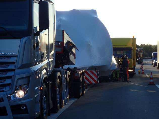 Mit einem Reifenschaden am Auflieger war in der Nacht ein Schwertransport auf der A 61 kurz vor dem Parkplatz Wiesbach zwischen den Anschlussstellen Bornheim und Gau-Bickelheim liegen geblieben. Gleich zwei Reifen platzten an dem Fahrzeug, das daraufhin nicht mehr weiterfahren konnte. Aufgrund des Schwertransportes an sich und weil sich Reifenteile um die Bremsen gewickelt hatten, war die Reparatur aufwändig und dauerte entsprechend lange. Die Autobahnmeisterei sicherte den Transport zusätzlich zum Begleitfahrzeug wegen seiner Überbreite ab, bis ein Pannendienst die Reifen gewechselt hat. Ein Teil der Ladung ragte in den rechten Fahrstreifen. Der Verkehr konnte einspurig an dem Transport vorbeigeleitet werden. Zu nennenswerten Verkehrsbehinderungen kam es nicht. Die Reparaturarbeiten dauern derzeit noch an, sind aber in Kürze abgeschlossen.