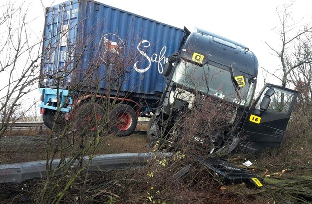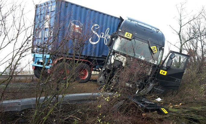 POL-VDMZ: Sattelzug kommt von der Fahrbahn ab und knickt ein