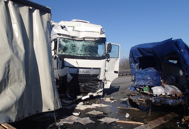 Dort fuhr in Fahrtrichtung Koblenz gegen 10:25 Uhr ein Sattelzug auf einen vorausfahrenden Kleintransporter mit Anhänger auf, der gerade verkehrsbedingt abbremsen musste. Der LKW geriet durch den Aufprall ins Schleudern, prallte in die Schutzplanken, knickte ein und stellte sich quer zur Fahrbahn. Er blockierte so die gesamte Richtungsfahrbahn Koblenz. Die Zugmaschine musste durch ein Abschleppunternehmen von der Unfallstelle geschleppt werden. Der Sattelzug war unbeladen. Der aus Bayern stammende 40-jährige Fahrer des Sattelzugs, der den abbremsenden Transporter offensichtlich zu spät erkannte, erlitt einen Schock. Er wurde in ein Bad Kreuznacher Krankenhaus eingeliefert. Am LKW entstand Sachschaden in Höhe von ca. 45.000 Euro. Der 61-jährige Fahrer des Transporters wurde durch den Unfall leicht verletzt und ebenfalls in ein Krankenhaus verbracht. Sein Fahrzeug und der Anhänger mussten ebenso abgeschleppt werden. Den Sachschaden an dem völlig beschädigten Transporter, dem Anhänger sowie dessen Ladung schätzt die Polizei auf ca. 60.000 Euro. Auf dem Anhänger war eine Getränkeabfüllmaschine geladen.