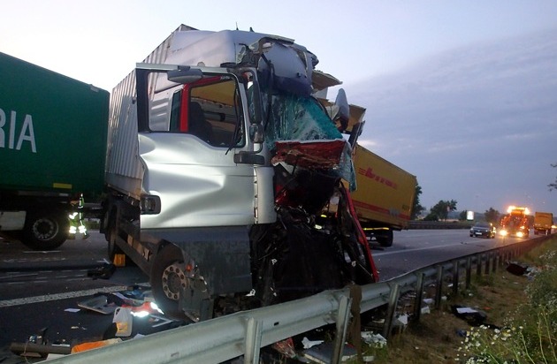 Ein schwerer Verkehrsunfall vor der Dauerbaustelle auf der A61 bei Mörstadt ist Ursache für erhebliche Verkehrsbehinderungen in Fahrtrichtung Süden. Gegen 01.00 Uhr heute Nacht musste die Fahrbahn zunächst für einen Schwertransport voll gesperrt werden. Dadurch kam es zu einem kurzen Rückstau. Gerade als der Schwertransport die Engstelle durchfahren hatte und der Stau sich aufzulösen begann, fuhr ein mit Hygieneartikeln beladener Lastzug aus dem Raum Köln trotz mehrfacher beleuchteter Warnzeichen am Fahrbahnrand nahezu ungebremst auf einen Lastzug eines Paketdienstleisters aus Böblingen am Stauende auf. Die beiden Lastzüge verkeilten sich derart, dass sie beide Fahrspuren komplett blockierten. Der 77-jährige Unfallverursacher wurde in seinem Führerhaus lebensgefährlich verletzt eingeklemmt und musste von der Feuerwehr herausgeschnitten werden. Der 52-jährige Böblinger erlitt leichte Verletzungen. Es entstand Sachschaden in Höhe von 70.000 Euro. Die Aufräumarbeiten dauern noch an. Trotz weiträumiger Umleitungsempfehlungen hat sich ein 10 Kilometer langer Stau gebildet. Inzwischen rollt der Verkehr auf der linken Fahrspur an der Unfallstelle vorbei. Gegen 09.00 Uhr ist mit der vollständigen Freigabe der Fahrbahnen zu rechnen.