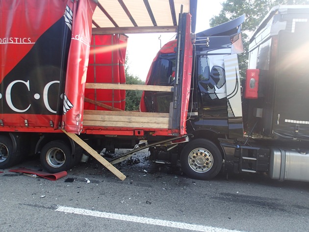Am heutigen Morgen kam es gegen 09:50 Uhr zu einem schweren LKW-Unfall auf der A 61 Richtung Koblenz bei Gau-Bickelheim. Ein 32-jähriger LKW-Fahrer aus Sachsen-Anhalt musste verkehrsbedingt seinen LKW bis zum Stillstand abbremsen. Ein 33-jähriger LKW-Fahrer aus Rheinland-Pfalz erkannt die Situation zu spät und fuhr fast ungebremst auf den stehenden LKW auf. Beide Fahrer wurden leichtverletzt und kamen vorsorglich in ein Krankenhaus. Es entstand ein Sachschaden von ca. 80.000EUR. Im Rahmen der Aufräumarbeiten kam es zu erheblichen Behinderungen für den Verkehr, die staulänge betrug zwischenzeitlich 10 km.