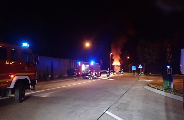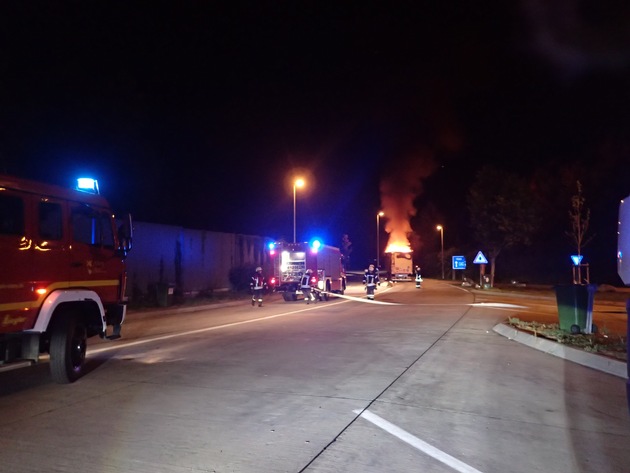 Die sofort entsandten Einsatzkräfte stellten vor Ort einen in Vollbrand stehenden Gefahrgutauflieger am Ende des Parkplatzes fest und sicherten bis zum Eintreffen der Feuerwehr die Gefahrenstelle weiträumig ab, da zunächst nicht bekannt war, welche Stoffe der Auflieger geladen hatte.