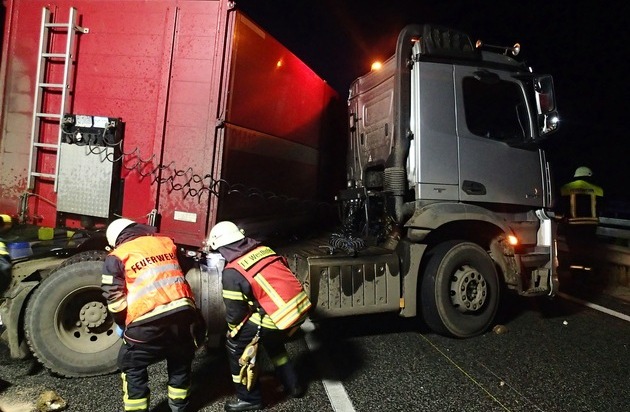 Verletzt wurde niemand. Alle drei Lkw mussten allerdings abgeschleppt werden und es entstand ein Sachschaden in Höhe von ca. 130.000 Euro. Mit einsetzendem Berufsverkehr kam es zu längeren Staus. Gegen 07.00 Uhr konnte die Fahrbahn in Richtung Norden freigegeben werden. Die Aufräumarbeiten in Richtung Süden werden noch den ganzen Tag andauern. Insgesamt sind 31 Einsatzkräfte von Polizei, Feuerwehr und Autobahnmeisterei im Einsatz.