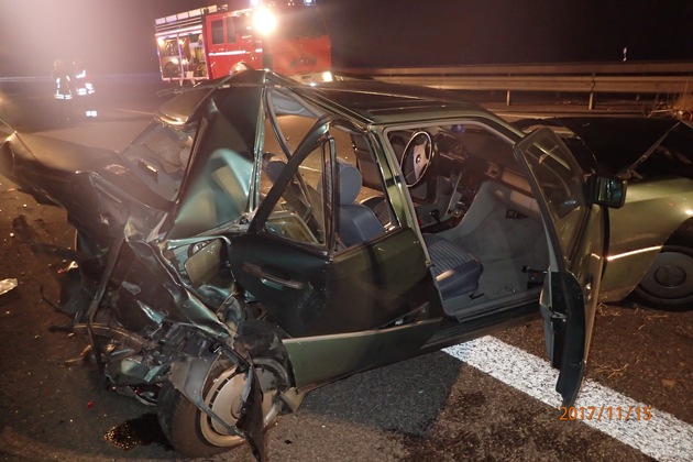 Am Mittwoch, 15.11.2017, gegen 21.30 Uhr ereignete sich auf der A63 in Fahrtrichtung Kaiserslautern, zwischen den Anschlussstellen Saulheim und Wörrstadt, ein schwerer Verkehrsunfall. Ein 54 jähriger Fahrzeugführer aus der Verbandsgemeinde Wörrstadt befuhr mit seinem BMW X6 den rechten Fahrstreifen der Autobahn und fuhr aus derzeit nicht geklärten Gründen mit sehr hohem Geschwindigkeitsüberschuss auf einen vorausfahrenden Mercedes-Benz E-Klasse auf. Durch den heftigen Aufprall wurde das Fahrzeugheck des Mercedes in die Fahrgastzelle gedrückt. Der alleinige Insasse des Mercedes, ein 60 Jähriger aus der Verbandsgemeinde Nieder-Olm, wurde in seinem Fahrzeug eingeklemmt und musste von Einsatzkräften der Feuerwehr Nieder-Olm mit schwerem Gerät geborgen werden. Er erlitt durch den Unfall schwere, jedoch nicht lebensbedrohliche Verletzungen. Der Fahrer des BMW wurde ebenfalls schwer verletzt, konnte sich jedoch selbst aus seinem Fahrzeug befreien. Beide Verletzten wurden am Unfallort notärztlich betreut und anschließend in verschiedene Kliniken eingeliefert. Zur Unfallaufnahme und zur Reinigung der Fahrbahn musste die A63 in Richtung Kaiserslautern ab der Anschlussstelle Saulheim bis gegen 01.00 Uhr voll gesperrt werden. Im Einsatz waren der Rettungsdienst mit zwei Notärzten, 16 Einsatzkräfte der Feuerwehr Nieder-Olm, die Autobahnmeisterei Heidesheim sowie die Polizeiautobahnstation Heidesheim. Zeugen melden sich bitte bei der Polizeiautobahnstation Heidesheim, Tel.: 06132-9500 (J.T.)