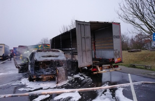 Ein 61-jähriger PKW Fahrer aus dem Saarland bemerkte, dass es während der Fahrt auf der A63 von KL Richtung MZ kurz vor dem Parkplatz Heubergerhof aus bislang ungeklärter Ursache aus dem Motorraum seines Fahrzeuges qualmt. Er fährt auf den Parkplatz und stellt dort das Fahrzeug neben einem geparkten Sattelzug ab. Dessen Fahrer bemerkt ebenfalls das qualmende Fahrzeug, nimmt einen Feuerlöscher aus seinem Führerhaus und versuchte noch vergeblich mit diesem den bereits beginnenden Brand im Motorraum des PKW zu löschen. Nachdem dies misslingt koppelt der LKW-Fahrer geistesgegenwärtig die Zugmaschine seiner LKW-Kombination ab. Er konnte jedoch nicht verhindern, dass die hintere Beleuchtung verschmort, da der PKW in Vollbrand und bereits der leere Sattelauflieger linksseitig in Brand gerät. Der PKW brennt völlig aus. Der Fahrer kann noch wenige Gegenstände aus dem Laderaum retten. Der LKW Auflieger wird an der linken Seite komplett durch Hitzeentwicklung und Brand beschädigt. Ein gänzliches Übergreifen der Flammen auf den Auflieger kann durch die Feuerwehr unterbunden und beide Fahrzeuge gelöscht werden. Beide Fahrzeuge sind nicht mehr fahrbereit und müssen abgeschleppt und geborgen werden. Der Parkplatz wird für die Dauer der Lösch- und Bergungsarbeiten komplett gesperrt. Die Autobahnmeisterei Gau-Bickelheim kümmert sich um die Absicherung des Brandortes. Die Fahrbahn muss aufgrund des mit dem Asphalt verschmolzenen Kunststoffes abgefräst werden. Der Gesamtschaden dürfte sich auf rund 45000 Euro belaufen. Verletzt wurde glücklicherweise niemand.