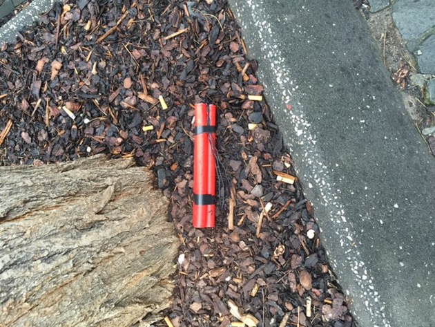 Am 05.02.2016, 11:05 Uhr, rief ein Mainzer Bürger die Polizei an und teilte mit, dass in der Mailandsgasse etwas, was wie eine Sprengstoffattrappe aussieht (drei rote Stangen, schwarzes Kabel, circa 15 Zentimeter lang), an einem Baum liegt. Die Polizei rückte aus, sperrte die betroffene Straße und das nähere Umfeld ab und wartete auf den Delaborierer des Landeskriminalamtes. Dieser konnte gegen 11:40 Uhr Entwarnung geben. Der Gegenstand wurde Spuren schonend sichergestellt, die Straßensperrung aufgehoben. Hinwiese bitte an die Polizeiinspektion 1: 06131 - 65 4110