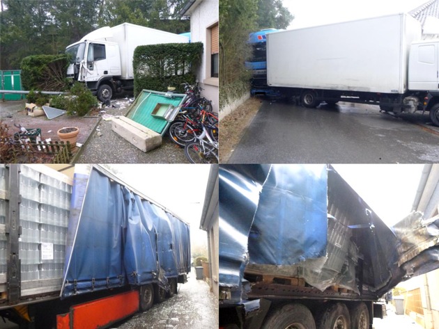 In der leichten Gefällstrecke stehen bereits ein Sattelzug aus Holland (Fahrer 63), sowie ein 7,5 Tonner aus Offenbach (Fahrer 40). Diese beiden LKW sind wegen der Glätte in der Gefällstrecke stehen geblieben. Der nachfolgende, mit Glasflaschen beladene, Sattelzug bremste ab und kam dabei auf der glatten Fahrbahn ins Rutschen. Hierbei prallte er mit der linken Seite des Aufliegers gegen das Heck des holländischen Sattelzugs. Danach verlor der polnische Fahrer (25 Jahre) die Kontrolle über seinen LKW. Dieser prallte rechts gegen einen Treppenaufgang in ein Wohngebäude, kam anschließend nach links und kollidierte mit einer Hauswand und dem dort stehenden 7,5-Ttonner. Diesen schob er auf eine Grundstückseinfassung und gegen eine Straßenlaterne. Diese stürzte auf einen, auf dem Grundstück abgestellten PKW. Danach rutschte der LKW wieder nach rechts und prallte gegen eine Hangmauer. Der 7,5 t blieb auf der Laterne stehen und verkeilte sich mit dem Sattelzug. Es kam zu keinem Personenschaden