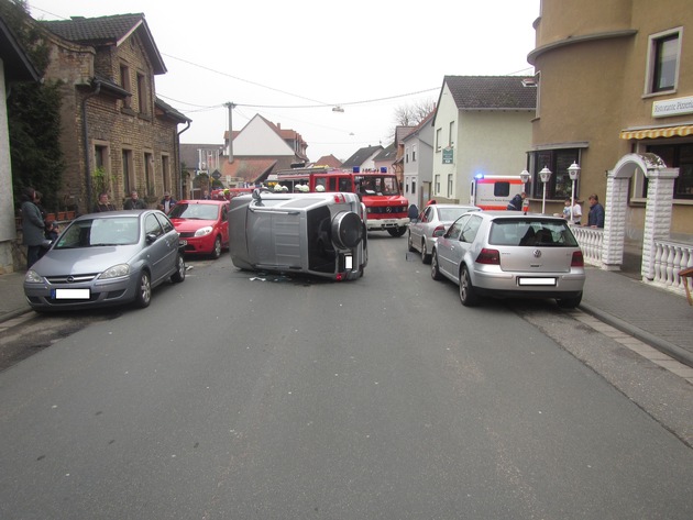Eine 71jährige Ober-Olmerin befährt am Freitag, den 12.01.2017, gegen 14:30 Uhr die Pariser Straße in Klein-Winternheim aus Richtung Bahnhofstraße in Richtung Autobahn A 63. Aus ungeklärter Ursache stößt sie mit der rechten Fahrzeugseite gegen ein dort geparktes Fahrzeug. Dabei verschieben schieben sich die rechten Reifen ihres Autos so, dass dieses kippt und auf der linken Fahrzeugseite zum Liegen kommt. Anschließend beschädigt sie hierdurch ein weiteres geparktes Auto. Die Ober-Olmerin kann durch Ersthelfer über die Hecktür des Fahrzeuges aus dem Auto befreit werden. Sie erleidet glücklicherweise nur leichte Verletzungen und wird aber vorsorglich in ein Mainzer Krankenhaus verbracht. Die Pariser Straße musste für ca. 1,5 h gesperrt werden. Zeugen des Unfalls werden gebeten sich mit der Polizeiinspektion Mainz 3 ( tel. 06131-65-4310) in Verbindung zu setzten.