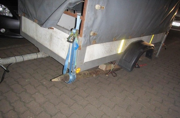 Ein Zeuge meldete einen PKW mit einem Anhänger, bei dem das fehlende linke Rad durch einen Holzstab ersetzt worden war. Dieser war professionell mit einem Spanngurten an dem Hänger befestigt worden. Der verantwortliche Fahrer fuhr damit von Schwabenheim bis Stadecken-Elsheim und hinterließ ungewöhnlich Zeichen auf die Straße. Ab und zu fing das Holz auch an zu qualmen. Wenn das so war, hätte er immer angehalten, erzählten der 27-jährige Fahrer und sein 30-jähriger Beifahrer im Rahmen der polizeilichen Verkehrskontrolle. Laut Zeugen hatten die beiden in der Ingelheimer Straße und in der Höhe des Rewe Parkplatzes pausiert. Das Gespann wurde von der Polizei aus dem Verkehr gezogen, der Fahrer verwarnt.