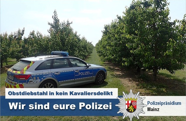 Am Dienstag, 19.06.2018, melden gegen 21:45 Uhr Zeugen der Polizei Mainz insgesamt vier Jugendliche, die gerade von einer Obstplantage Süßkirschen entwenden würden. Aufgrund der genauen Zeugenhinweise sowie der gemeinsam mit den Obstbauern ins Leben gerufenen Einsatzkonzeption, können drei der vier Jugendlichen nach einer kurzen Verfolgung und noch in Tatortnähe festgenommen werden.