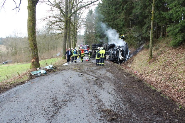 Am Mittwoch, 30.03.2016, gegen 15.30 Uhr, befuhr ein 56-jährige Lkw-Fahrer eines 26 Tonners die Landesstraße 278 zwischen Wildbergerhütte und Friesenhagen. Eingangs einer leichten Linkskurve kam ihm ein Pkw auf seiner Fahrbahnseite entgegen, woraufhin der Lkw-Fahrer nach rechts ausweichen musste. Hier kam er auf den unbefestigten Seitenstreifen, verlor die Kontrolle über sein Fahrzeug und schleuderte quer über die Fahrbahn. Anschließend stieß er mit der rechten Fahrzeugfront gegen einen Baum. Der Lkw wurde herum geschleudert, kippte um und kam auf der linken Fahrzeugseite, fast vollständig entgegengesetzt zur ursprünglichen Fahrtrichtung, zu stehen.. Der Fahrer konnte noch von Ersthelfern aus dem Führerhaus befreit werden, bevor dieses in Brand geriet. Schwer verletzt wurde der 56-jährige ins Krankenhaus verbracht. Am Lkw entstand wirtschaftlicher Totalsachschaden in Höhe von ca. 25.000.-EUR.