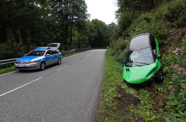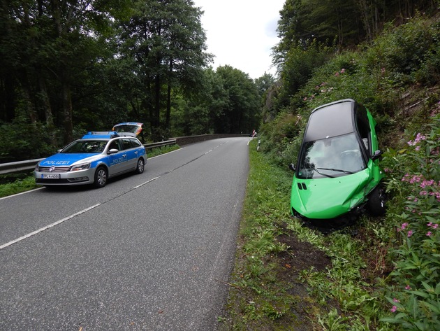Die beiden unfallbeteiligten Pkw befahren am Freitag, 04.08.2017, gegen 17:50 Uhr, hintereinander die L280 aus Richtung Daaden kommend in Richtung Alsdorf. Auf der kurvenreichen Strecke setzt der Unfallverursacher vor einer unübersichtlichen Kurve trotz Gegenverkehrs zum Überholen an. Um einen Zusammenstoß zu verhindern leitet der Fahrzeugführer, welcher überholt wird eine Vollbremsung ein. Hierdurch verliert er die Kontrolle über sein Fahrzeug und kommt nach links von der Fahrbahn ab gegen eine Schutzplanke. Von dieser wird er abgewiesen und schleudert über die Fahrbahn in den gegenüberliegenden Abhang. Hier kommt sein Fahrzeug zum Stillstand. Glücklicherweise wird der Fahrzeugführer bei dem Unfall nur leichtverletzt. Der Sachschaden beträgt ca. 2000 EUR. Der Unfallverursacher entfernt sich unerlaubt von der Unfallstelle. Bei dem Unfallverursacher soll es sich um einen schwarzen Audi mit SI Zulassung und einem S in den nachfolgenden Buchstaben sowie einer dreistelligen Zahl handeln. Die Polizei Betzdorf hat Ermittlungen wegen Verkehrsunfallflucht aufgenommen und bittet um Zeugenhinweise unter 02741 926-0 oder per Mail an pibetzdorf@polizei.rlp.de