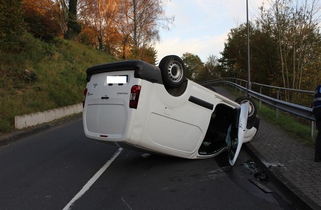 Am Mittwoch, den 18.10.2017, ereignete sich gegen 17:50 Uhr in der Walzwerkstraße ein Verkehrsunfall, als ein 28-jähriger Pkw-Fahrer aus Richtung B 62 / Unterführung kommend nicht die Vorfahrt eines von links kommenden Pkw-Transporters beachtete. Der vorfahrtberechtigte Transporter mit 39-jährigem Fahrer wurde von dem Pkw so unglücklich seitlich getroffen, das der Wagen gegen den hohen Bordstein prallte und dann seitlich umkippte. Der Transporter blieb erheblich beschädigt auf dem Dach liegen. Der Fahrer blieb glücklicherweise unverletzt.