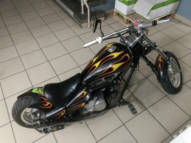 Am Samstag, dem 21.04.2018, fiel einer Funkstreife der PI Betzdorf gegen 00:45 Uhr in der Hauptstraße (K 119) in Steinebach ein sogenannter Mini-Chopper ohne Fahrlicht und Kennzeichen auf. Der Fahrer entzog sich der Kontrolle, indem er sein Krad nach einer kurzen Verfolgung am Straßenrand zurückließ und durch unwegsames Gelände zu Fuß flüchtete. Er warf zudem seinen schwarzen Motorradhelm weg. Am Lenker war ein schwarzes Halstuch mit dem Schriftzug "Black Seven Gang" befestigt. Die Polizei fragt in diesem Zusammenhang, wer Hinweise auf den Mini-Chopper und dessen Eigentümer geben kann. Ferner ergeht der Hinweis, dass Unfälle mit derartigen Fahrzeugen zu schweren Verletzungen führen können und etwaige geschädigte Personen auf ihren Kosten sitzen bleiben, weil keine Versicherung im Schadensfall die Haftung übernimmt.