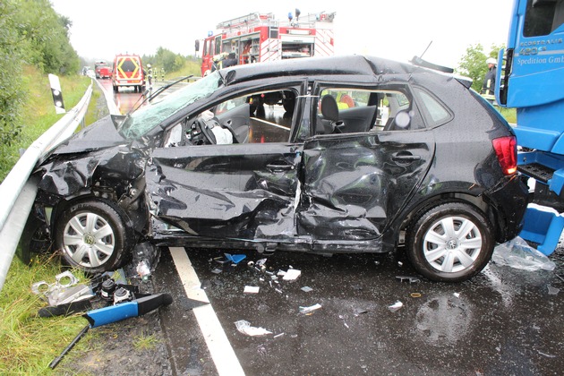 Am Montag, 17.08.2015, 17:47 Uhr, befuhr eine 18 jährige Fahrzeugführerin aus dem Lahn-Dill-Kreis die L 296 bei Stein-Neukirch und wollte nach links auf die B 54 in Richtung Rennerod auffahren. An der Einmündung hielt sie nach Zeugenangaben zunächst an, fuhr dann jedoch auf die B 54 auf, ohne die Vorfahrt eines von links kommenden Sattelzuges zu beachten. Der Führer des Sattelzuges versuchte noch, nach links auszuweichen, konnte jedoch eine Kollision nicht verhindern. Der Pkw der Unfallverursacherin wurde zunächst seitlich durch den Lkw erfasst und anschließend in die Leitplanke geschleudert. Die 18 Jährige wurde bei dem Unfall eingeklemmt und schwer verletzt. Ihr 18 jähriger Beifahrer konnte sich leicht verletzt selbst aus dem Pkw befreien. Nach der Bergung der Fahrzeugführerin wurde diese in eine Klinik nach Siegen verbracht. Bei dem Verkehrsunfall entstand ein Sachschaden von etwa 22.000,- Euro.