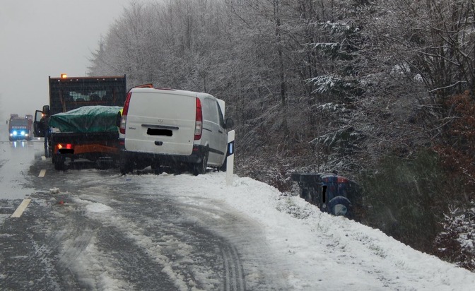 Gegen 13:00 Uhr wurde der Polizeiinspektion Montabaur per Notruf ein verunfallter Pkw gemeldet, der außerhalb der Ortschaft in Fahrtrichtung Höchstenbach unterwegs war. Aufgrund der Wetterlage, die sich mit Schneefall und Winterglätte für den 44-jährigen Fahrer aus dem benachbarten Hessen als schwierig gestaltete, kam der Pkw des Fahrers in einer Linkskurve nach rechts von der Fahrbahn ab und auf der rechten Fahrzeugseite in dem Straßengraben zum Erliegen. Er und seine 72-jährige Beifahrerin wurden dabei leicht verletzt. Der Fahrer kam seiner Verpflichtung noch nach, die Unfallstelle mit einem Warndreieck abzusichern. Auch hielten am Fahrbahnrand in gebührendem Abstand zwei weitere Kfz-Führer an, um ihre Hilfe anzubieten. Ein weiterer dritter Fahrer eines Lieferwagens erkannte die Situation nicht mehr rechtzeitig und fuhr auf den hinteren Wagen des Anhaltenden auf. Die Aufprallgeschwindigkeit war so stark, dass er diesen gegen den ersten Pkw des anderen Helfers aufschob und einen Gesamtschaden von ca. 6.000,-EUR verursachte. So musste die Funkstreifenwagenbesatzung der Montabaurer Polizei einen weiteren Verkehrsunfall aufnehmen, aus dem nun drei Beteiligte resultierten. Verletzt wurde bei diesem Unfall niemand.