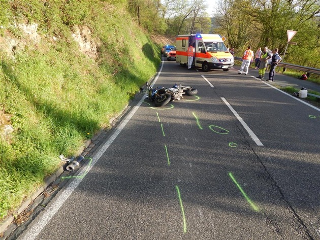 Am Donnerstagabend (21.04.2016) ereignete sich gegen 18:35 Uhr auf der Landstraße von Hömberg nach Nassau ein Verkehrsunfall, bei dem der 49 Jahre alte Fahrer eines Motorrades schwer verletzt wurde. Auf der Gefällstrecke wollte ein vor dem Krad fahrender Pkw nach rechts in den Scheubachweg abbiegen und bremste daher ab. Der Motorradfahrer versuchte noch über die Gegenfahrbahn auszuweichen, stürzte aber bei diesem Manöver. Zu einer Kollision mit dem Pkw kam es nicht. Der Kradfahrer wurde mit mehreren Frakturen, die zum Glück nicht lebensgefährlich waren, durch einen Rettungshubschrauber in ein Koblenzer Krankenhaus eingeliefert. Das Motorrad musste durch einen Abschleppdienst abgeholt werden. Die erforderliche Sperrung der Landstraße wurde um 19:20 Uhr wieder aufgehoben.