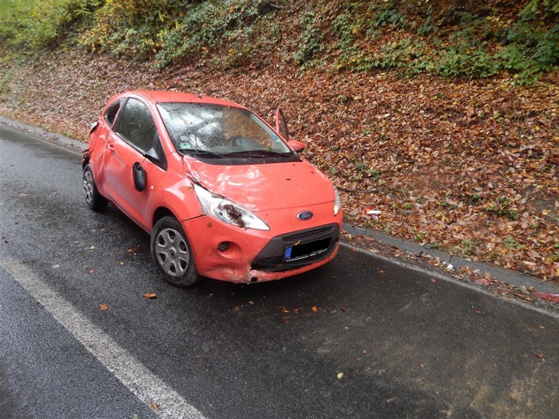 Am 07.11.2016, gegen 12:00 Uhr, befuhr eine 23-jährige Autofahrerin die Landesstraße 332 von Nassau in Richtung Schweighausen. Ausgangs einer Rechtskurve verlor sie, vermutlich aufgrund nicht angepasster Geschwindigkeit auf der laubbedeckten und nassen Fahrbahn, die Kontrolle über Ihren PKW und kam nach rechts von der Fahrbahn ab. Der PKW überschlug sich anschließend im Hang neben der Fahrbahn, wurde zurückgewiesen und kam wieder auf den Rädern zum Stehen. Die junge Unfallfahrerin wurde glücklicherweise nur leichtverletzt, ihr Auto jedoch total beschädigt. POLIZEIINSPEKTION BAD EMS - Telefon 02603/970-0 - E-Mail: pibadems@polizei.rlp.de ********************************************************************* ************************************************************